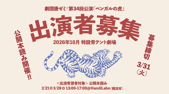 《4日間》第二幕『下谷万年町物語』リーディングワークショップ - 2026年2月 2日 ☆出演者募集☆第34回公演『ベンガルの虎』